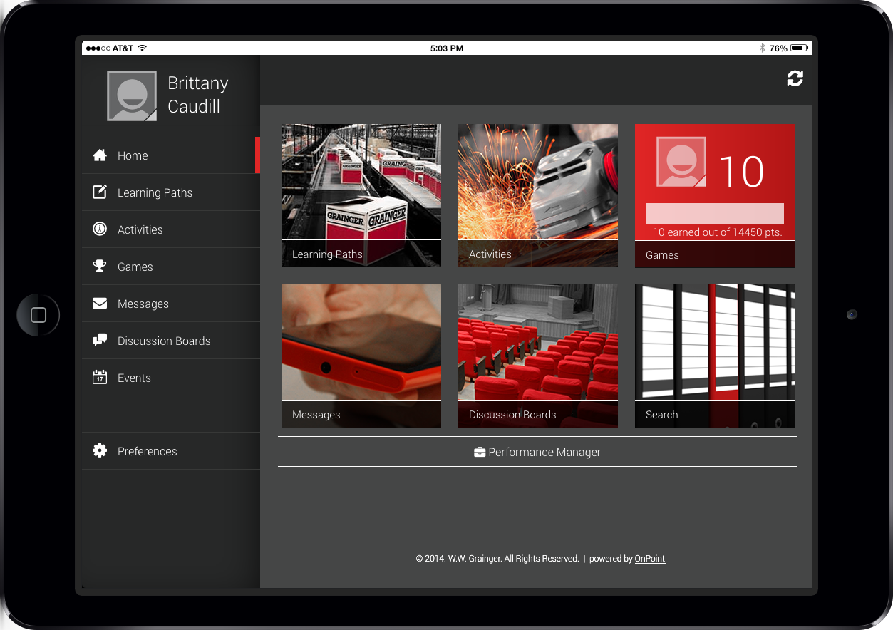 To provide a consistent experience for new hires who might prefer to learn through their desktop or laptop PC, Grainger also implemented an online Learning Portal which aligned both functionality and aesthetically with their mobile and tablet environments. Game mechanics, discussion boards, formal training, and any informal activities to be completed are all now available through a standard web browser and users can switch modalities at any time.