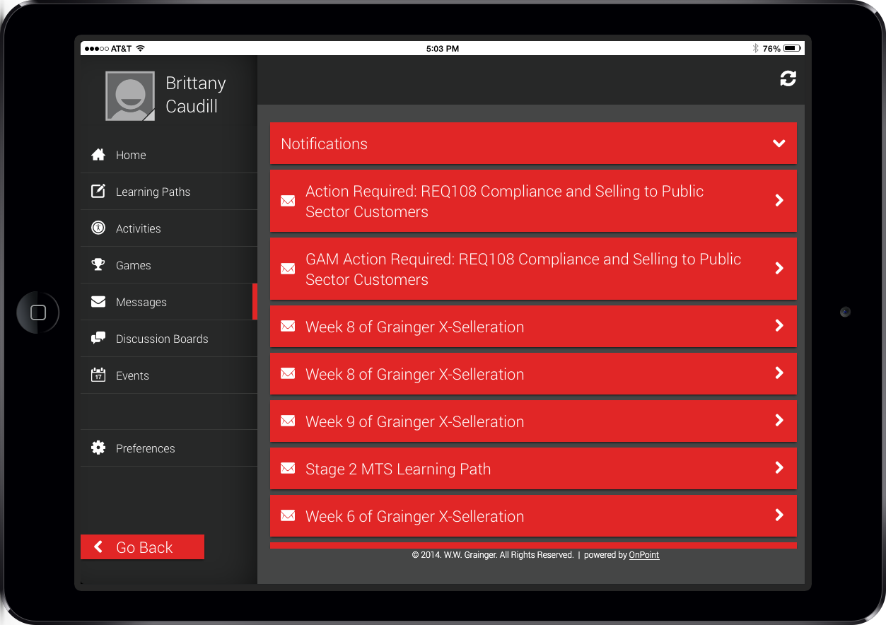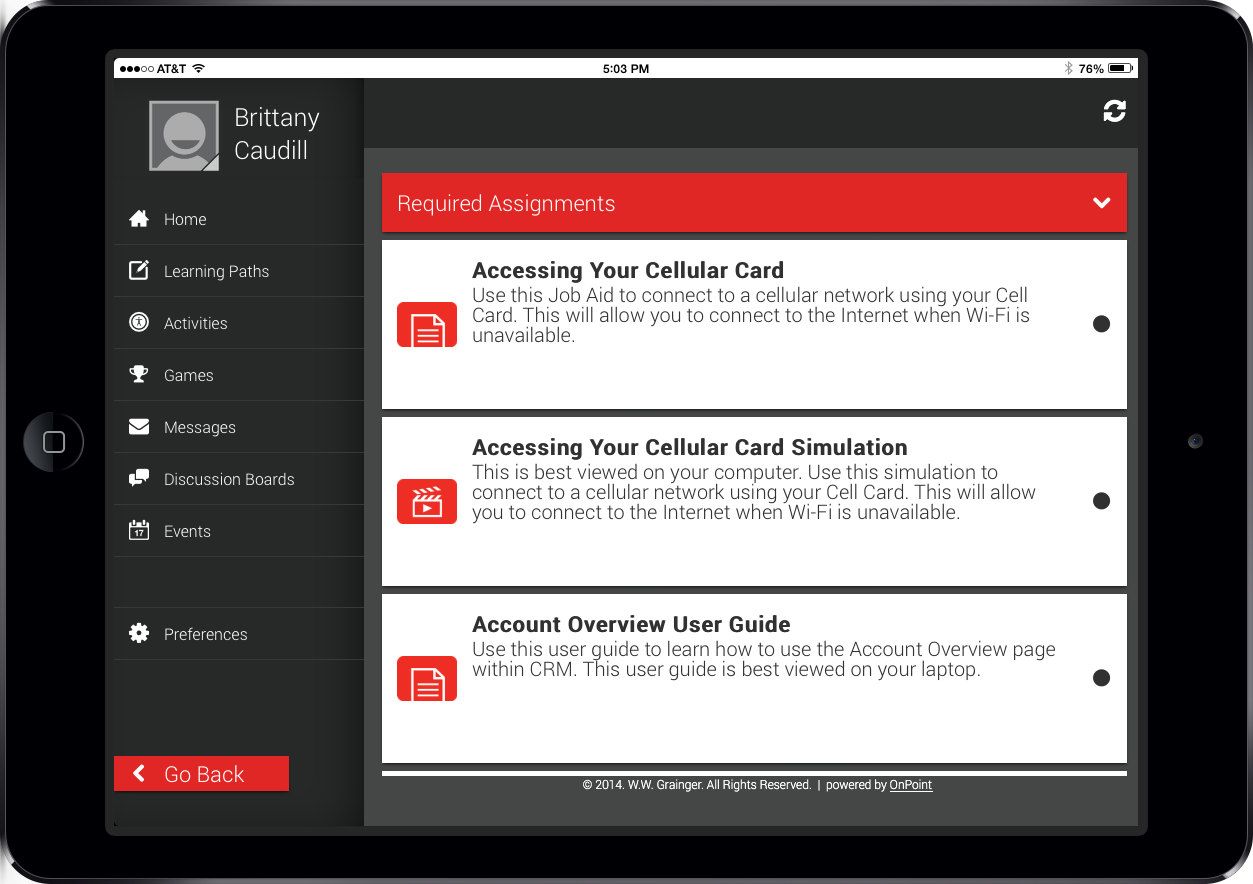 Grainger is a Fortune 500 industrial supply company established in 1927 to provide an efficient solution for fulfilling business customers’ needs through direct sales and catalog services. Grainger began working with OnPoint in 2013 in an effort to rethink their onboarding process for outbound sales associates using mobile technology by eliminating printed training materials and providing improved ways to engage these new hires with the company, their managers/mentors and their peers. Today, Grainger is one of OnPoint’s premiere use cases for online and mobile delivered training programs applying scores of available features in innovative ways to help them save time, money, and improve business results.